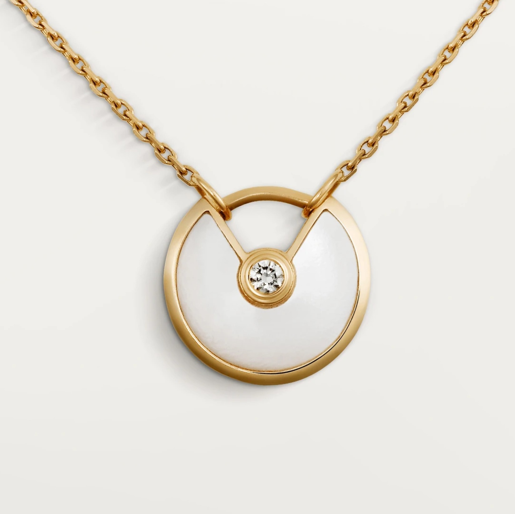 アミュレット ドゥ カルティエ ネックレス XS、18Kイエローゴールド、ブリリアントカット ダイヤモンド1個(0.02ct)、ホワイトマザーオブパール。モチーフ直径:12 mm。チェーン:38-41 cm(調節可能)。