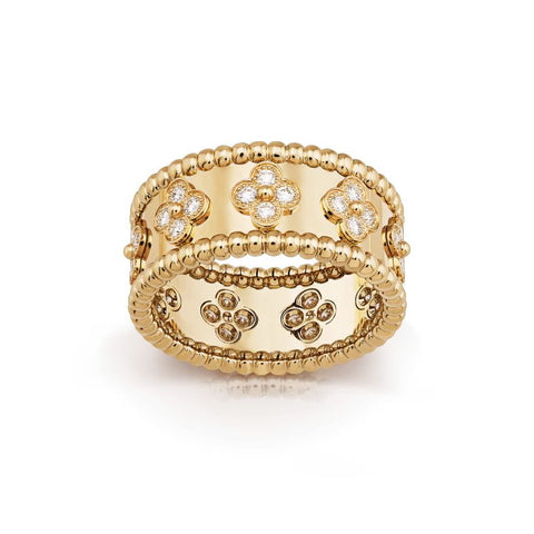 ペルレ クローバー リング、イエローゴールド、ラウンドカット ダイヤモンド、スモールモデル。ダイヤモンド DEF IF~VVS。