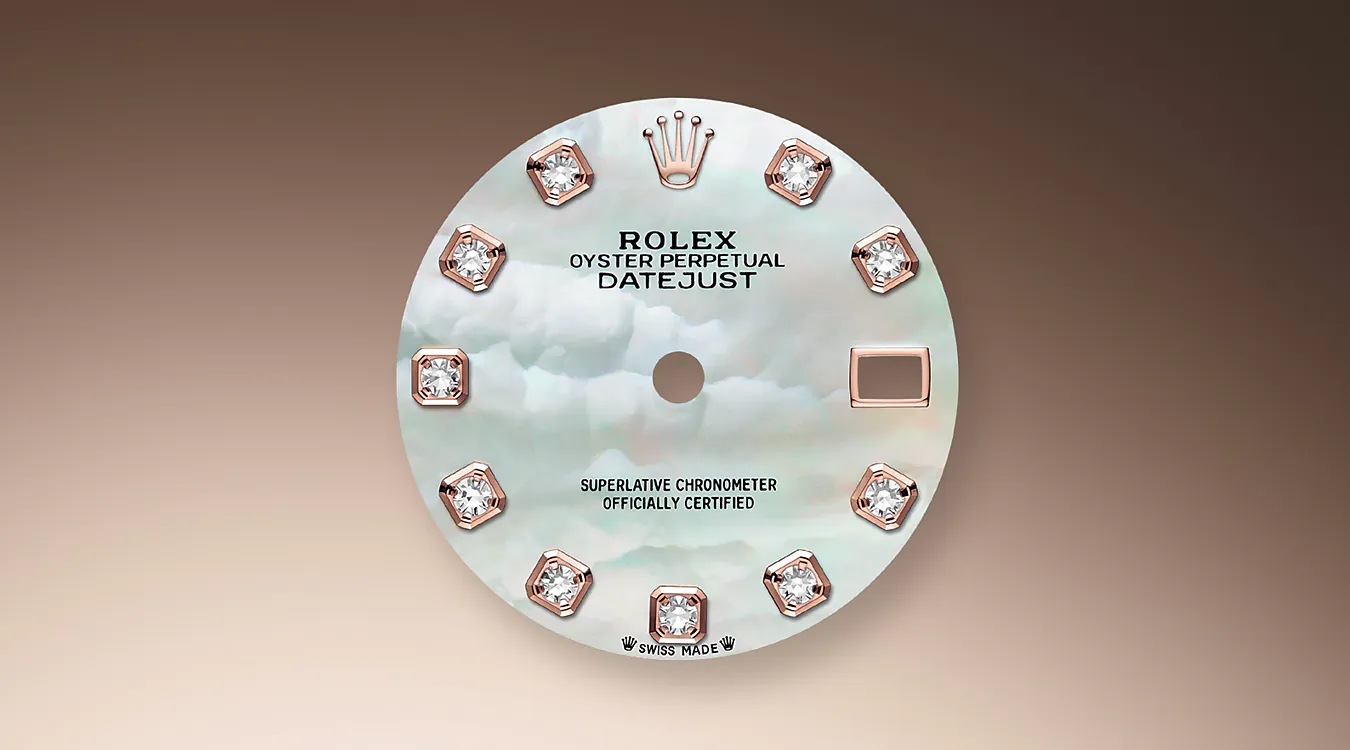 マザーオブパールは、驚きに満ちた神秘的な性質を備えている。産地によってピンク、ホワイト、ブラック、イエローと 色彩が異なり、貝殻の採取部位によっても色彩の強度や構造が変化する。ロレックスのマザーオブパールには人工的な着色は一切行われない。代わりに、特別なノウハウとスキルを駆使し、その自然の美しさのみを際立たせ、本来の色合いを保持している。マザーオブパールのダイアルにはふたつとして同じものはない。